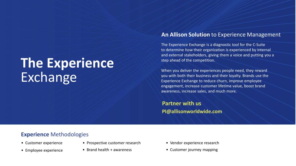 The Experience Exchange is Allison’s solution to identify and close these experience gaps. It will arm organizations with an in-depth understanding of these gaps and provide data-driven recommendations that will lead to increased engagement and loyalty, and ultimately improved operational and business outcomes.