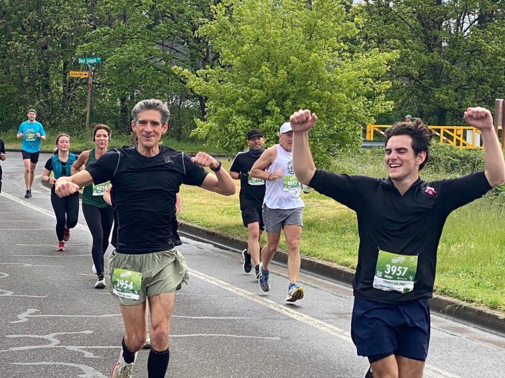 Every day last fall and winter as I reclined onto the radiation table for my prostate cancer treatment in San Diego, I would close my eyes and envision myself – free of cancer – alongside my son Connor at the starting line of the Eugene Marathon in Oregon. As my motivation and focus, I viewed each of the 35 treatments as part of my training for the race, which would be my 21st and most meaningful marathon. And as many runners know, having a training partner makes a world of difference. Mine was Connor, 833 miles away as a student at the University of Oregon (UO), simultaneously training to join me and run his very first. The goal was for us to meet at the starting line after I completed my last treatment and embark on one of life’s great accomplishments and memories, running a marathon together with me having conquered cancer, finishing in storied Hayward Field, UO’s legendary track and field stadium.