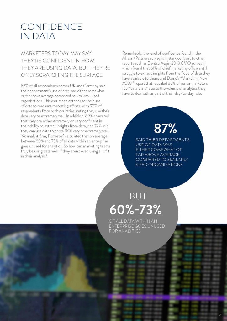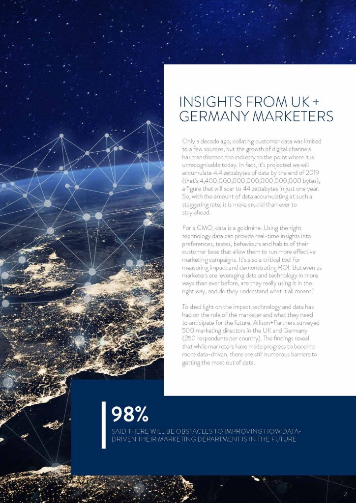 To shed light on the impact technology and data has had on the role of the marketer and what they need to anticipate for the future, Allison+Partners surveyed 500 marketing directors in the UK and Germany (250 respondents per country). The findings reveal that while marketers have made progress to become more data-driven, there are still numerous barriers to getting the most out of data.