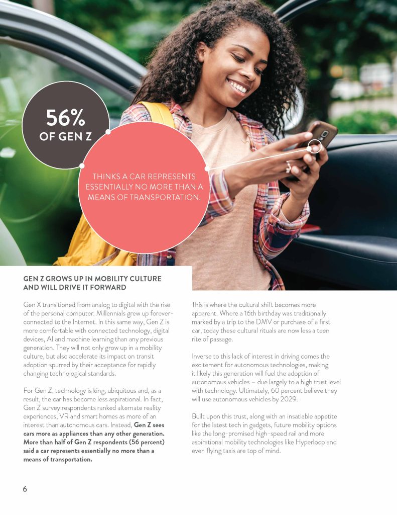Resulting from the intersection of transportation and technology, this cultural shift will be driven forward by a new generation of consumers – those just now coming of driving/ride-sharing age. Much in the way Baby Boomers in their teens and twenties defined American car culture, Gen Z will ultimately become synonymous with mobility culture.